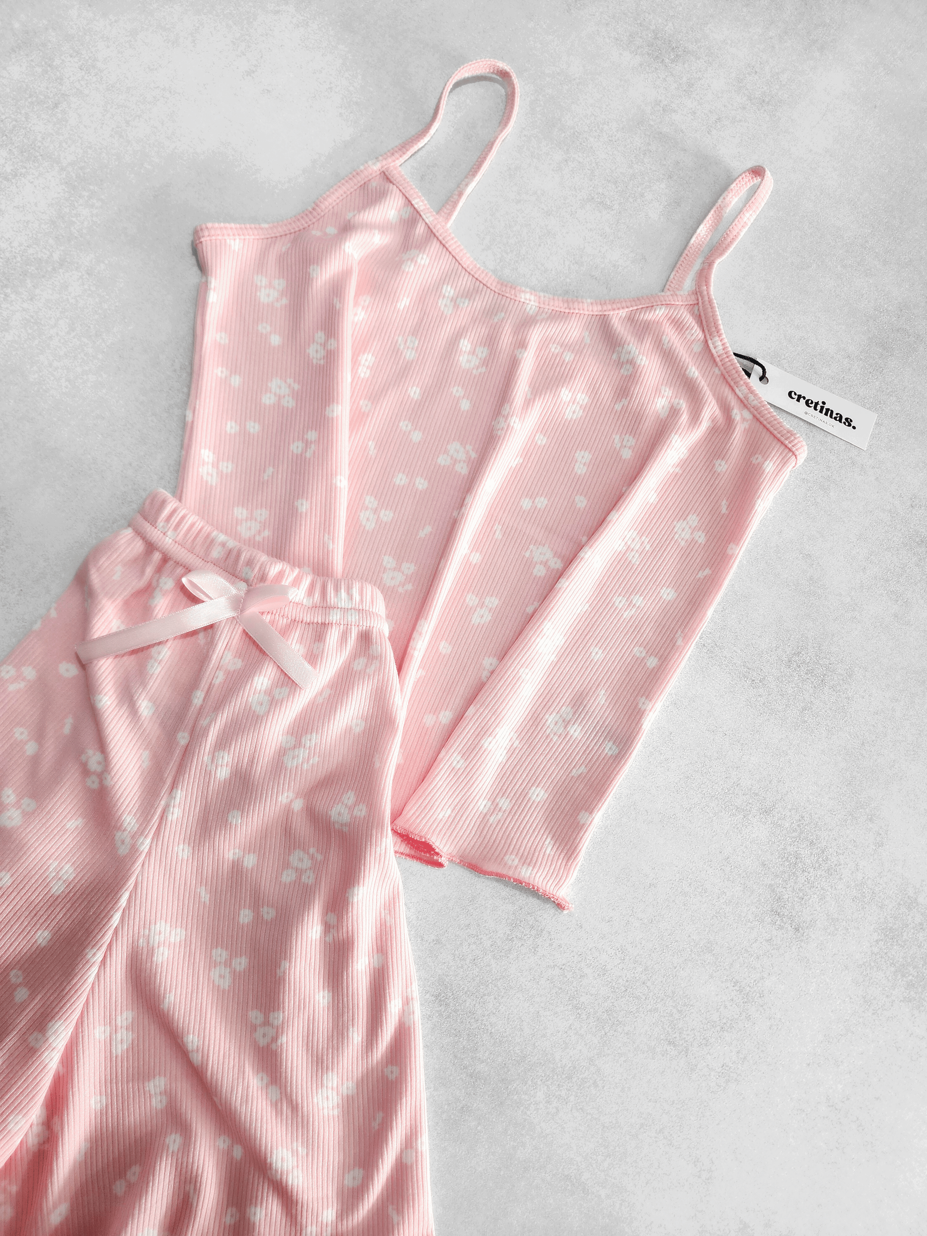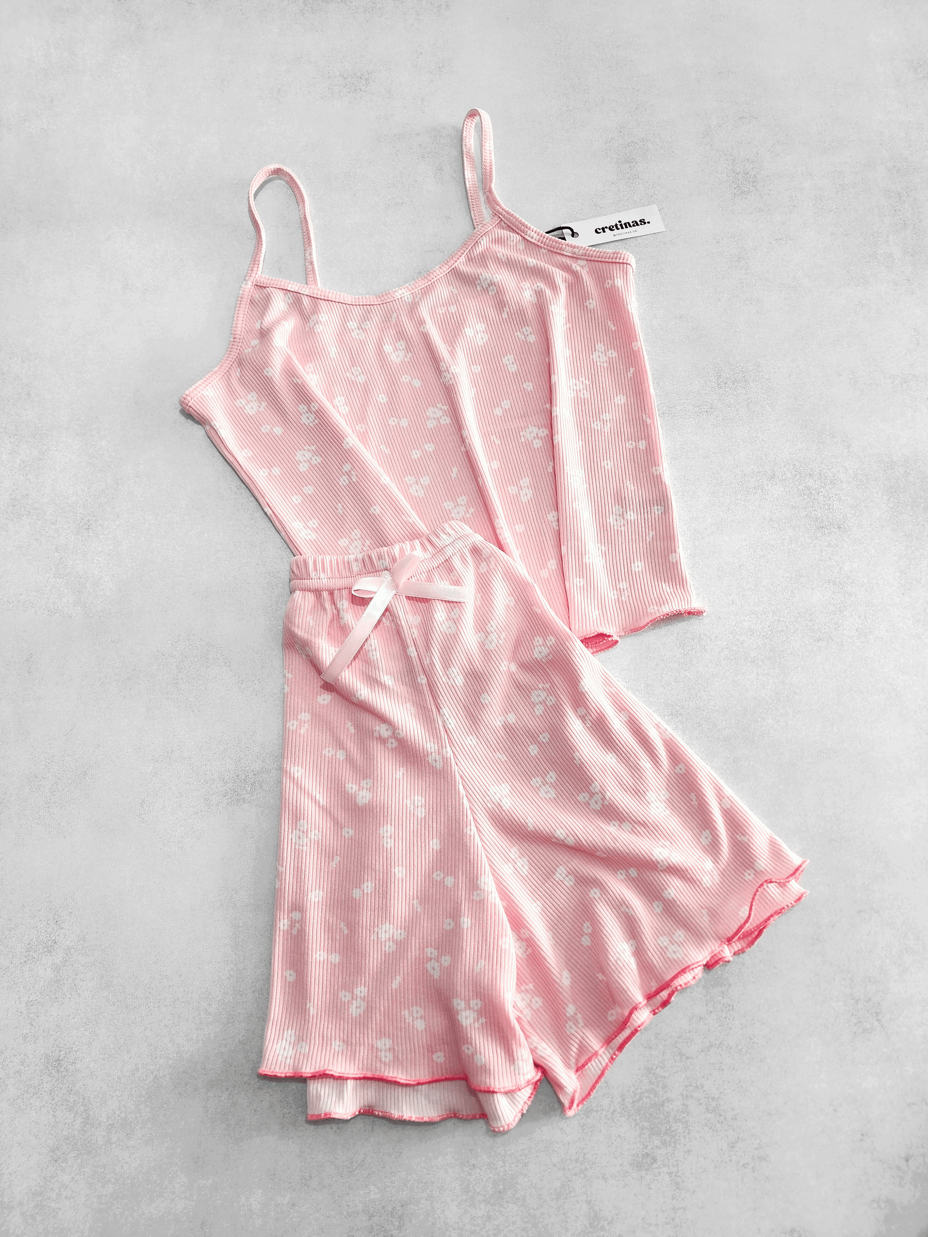 Tela morley. Remera musculosa con tiritas. Short con elástico y moño decorativo.